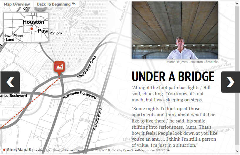 Ultimately, it spurred changes to federal regulations and local practices, which moved veterans off the streets and into assisted housing faster. Personally, I was moved by the resilience of a former Marine as he showed me the benches, bushes and bridges he made home while unnecessarily waiting for help. I turned that tour into a narrative, interactive map.